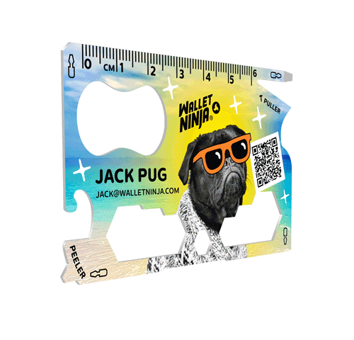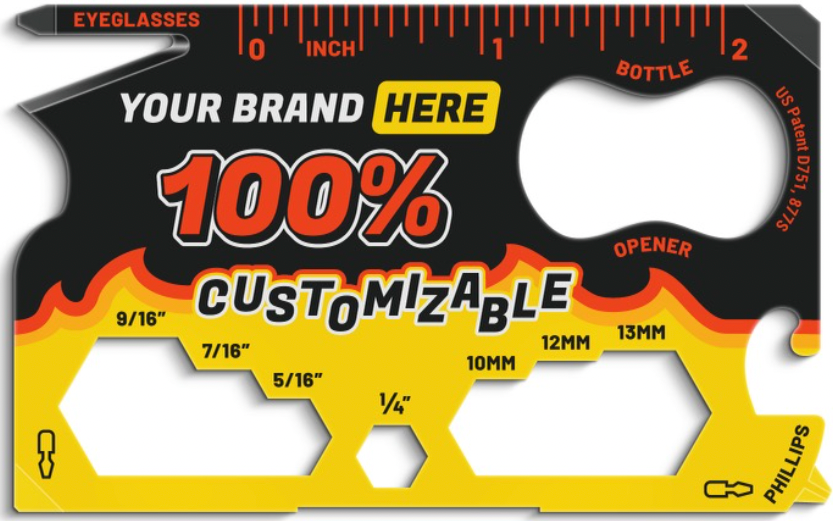Each time your client reaches for the Wallet Ninja to open a bottle, tighten a screw on his/her glasses, make a measurement, open a shipment from Amazon, peel an orange, or use any of the 18 tools, your brand is in their hands!